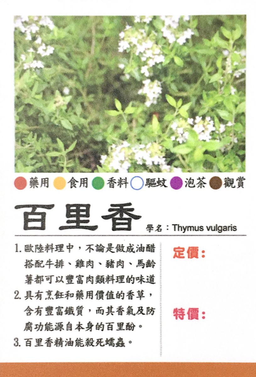 麝香草或百里香是一種採擇自百里香屬品種植物、具有烹飪和藥用價值的香草,含有豐富鐵質,而其香氣及防腐功能源自本身的百里酚。 常用料理:湯品、燉煮料理、肉類與蔬菜,堪稱百搭。