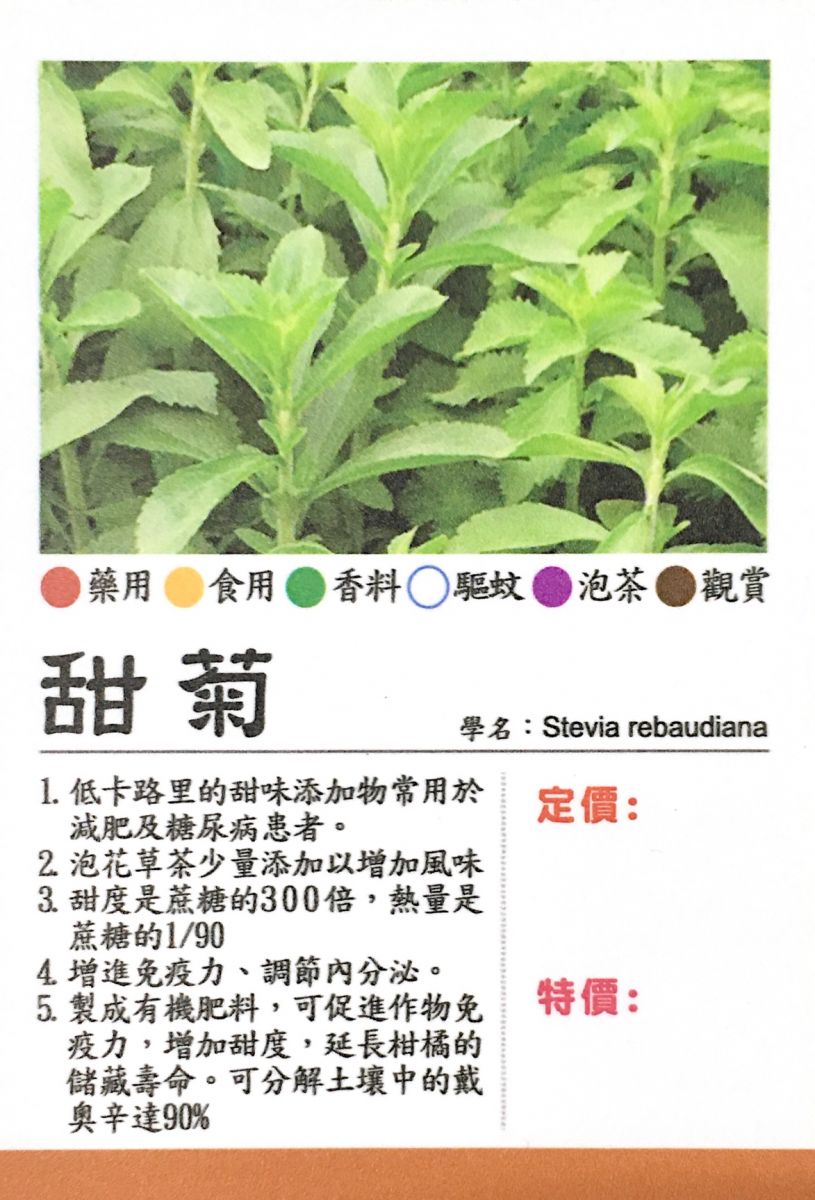 性喜溫暖氣候環境,土壤以排水良好而含有豐富的有機質之砂質壤土為佳,為一種甜味作物,葉部為甜分之主要分佈所在,花及莖部較少,此甜味成分稱之為甜菊糖,其甜度約為蔗糖的300倍。