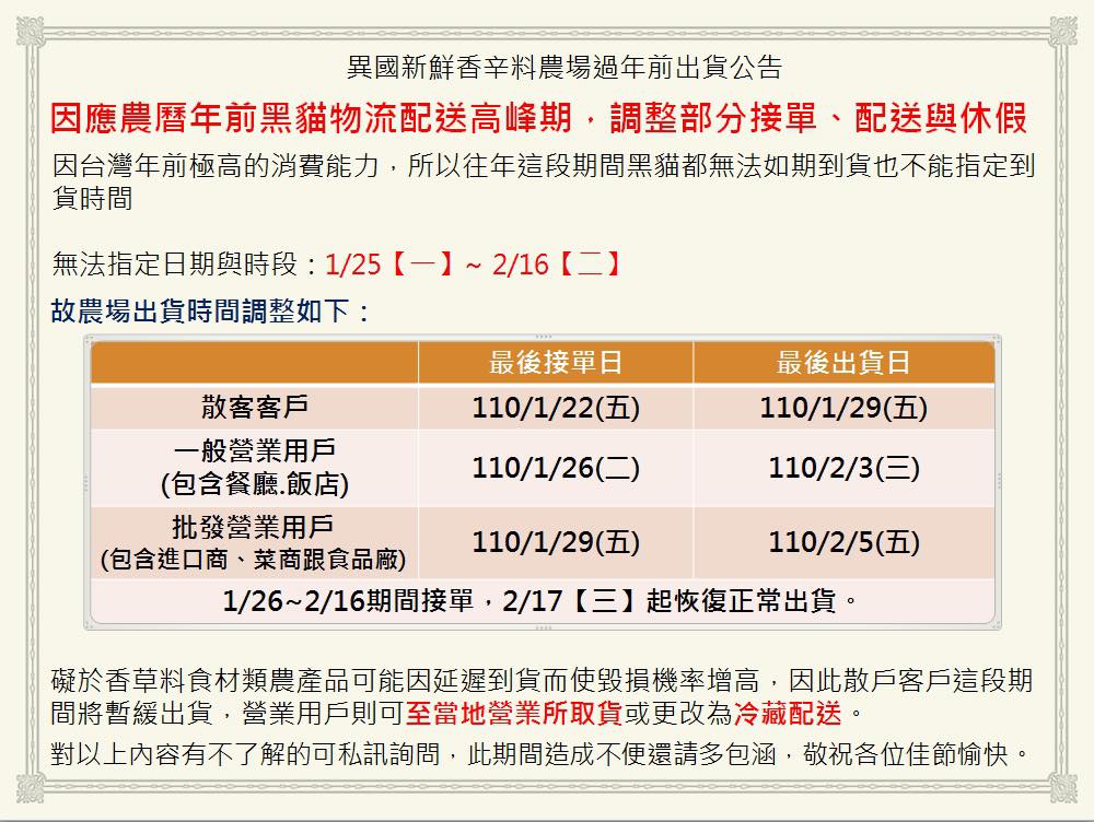 因應大陸雙11購物節.台灣也是跟進有極高的消費能力.所以往年這段期間黑貓都無法如期到貨.11/9-11/14(無法指定日期與時段)礙於香草料食材類農產品可能因延遲到貨.有極高毀損機率.所以暫緩散戶這段期間出貨.營業用戶可至當地營業所取貨或全部改由冷藏配送.11/15恢復正常............